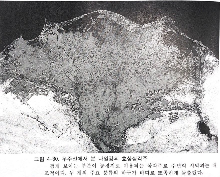 나일강삼각주는 전면의 윤곽이 볼록하여 호상삼각주라고도 불리운다. 카이로 부근에서 나일강은 두개의 큰 분류로 갈라지는데, 동쪽 분류의 하구와 서쪽 분류의 하구가 바다로 돌출해 있고, 이들 하구의 양쪽 해안에는 윤곽이 전체 삼각주와는 달리 오목한 사빈이 발달되어 있다.(그림4-30). 사빈의 뒤에는 석호도 나타난다. 나일강은 세계적인 대하천으로서는 유량이 적지만 지중해의 조차가 아주 작아서 상당히 넓은 삼각주를 형성할 수 있었다. 그런데 1964년에 아스완댐이 건설된 이후 토사유입량이 격감하여 특히 삼각주 전면에서는 침식과 침수에 의한 피해를 심하게 겪게 된 것으로 알려졌다. 지금과 같은 추세가 계속되면 100년 후에는 많은 농경지와 함께 삼각주 전면의 양쪽 끝에 자리한 항수도시인 인구 100만의 알렉산드리아와 50만의 포트사이드가 바닷물에 잠길 것이라고 한다.
