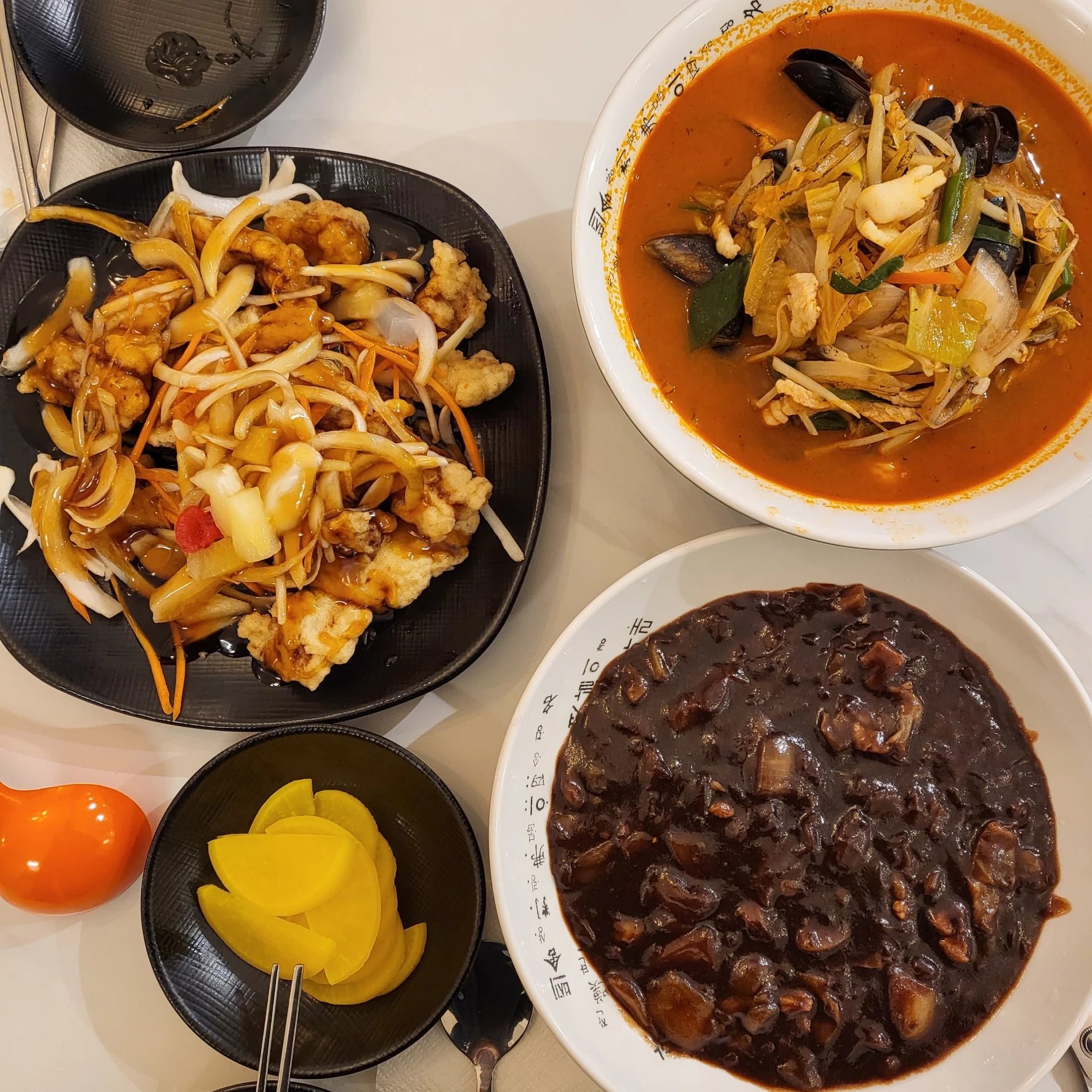 짜장한개 짬뽕하나 탕수육 미니를 주문했다. 사실 둘이먹기엔 좀 양이 많은것같긴하지만.. 탕수육을포기할순없지